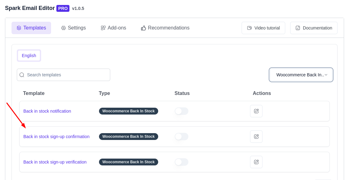 Navigate to the WordPress Dashboard → Spark Email Editor → Addons, and enable the Back-In-Stock Notifications Addon.